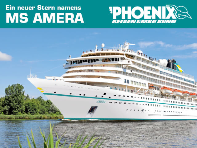 Neuzugang in der Phoenix-Seerreisen Flotte - Mit Spannung erwartet, sind die Verträge nun unterzeichnet und spätestens ab dem 21.August 2019 strahlt ein neuer Stern namens MS AMERA am Phoenix-Kreuzfahrt-Himmel. Freuen Sie sich auf ein weiteres schwimmendes Phoenix-Zuhause, das Sie zu den schönsten Plätzen dieser Welt begleitet!